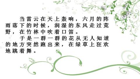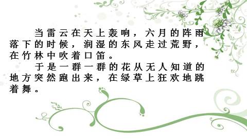 当雷某某在天上轰响,六月的阵雨落下的时候,润湿的东风走过荒野,在竹林中吹着口笛。 于是一群一群的花从无人知道的地方突然跑出来,在绿草上狂欢地跳着舞。