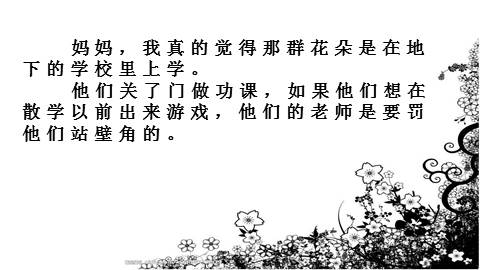 妈妈,我真的觉得那群花朵是在地下的学校里上学。 他们关了门做功课,如果他们想在散学以前出来游戏,他们的老师是要罚他们站壁角的。