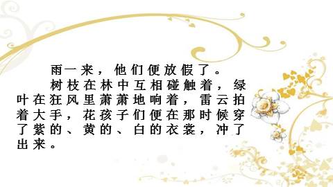 雨一来,他们便放假了。 树枝在林中互相碰触着,绿叶在狂风里萧萧地响着,雷某某拍着大手,花孩子们便在那时候穿了紫的、黄的、白的衣裳,冲了出来。