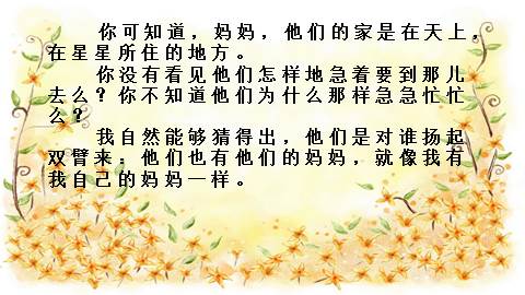 你可知道,妈妈,他们的家是在天上,在星星所住的地方。 你没有看见他们怎样地急着要到那儿去么?你不知道他们为什么那样急急忙忙么? 我自然能够猜得出,他们是对谁扬起双臂来:他们也有他们的妈妈,就像我有我自己的妈妈一样。
