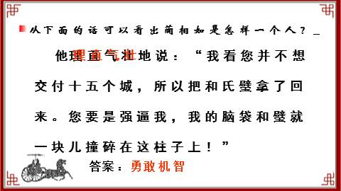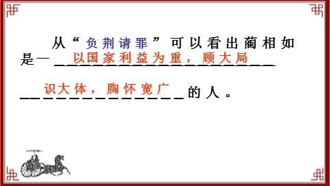 对事件能深思熟虑,随机应变,对秦王不顾生死,敢于斗争,对廉颇能顾全大局,忍辱退让,一切以国家利益为重。因为他为维护赵国利益一再立下功劳,先后被封为上大夫,上卿。