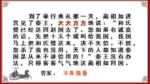 到了举行典礼那一天,蔺相如进宫见了秦王,大大方方地说:“和氏璧已经送回赵国去了。您如果有诚意的话,先把十五个城叫给我国,我国马上把和氏璧送来,决不失信。不然,您杀了我也没用,天下的人都知道秦国是从来不讲信用的!”秦王没有办法,只得客客气气地送蔺相如回国。