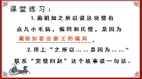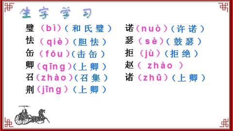 璧,古代玉器的一种,平圆形,中间有孔。本课的和氏璧,指的是用楚国人卞和发现的一块玉制成的璧。“完璧归赵”指把和氏璧完好无损地送回赵国。这个成语现在常用来比喻把东西完好无损地归还原主。