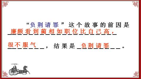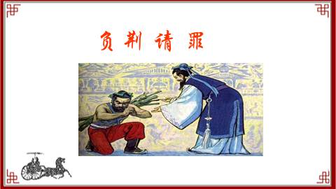 负,背着。荆,荆条,用来打人的东西。本课指廉颇光着上身,背着荆条,到蔺相如家请罪。这个成语现用来表示向人认错赔罪。