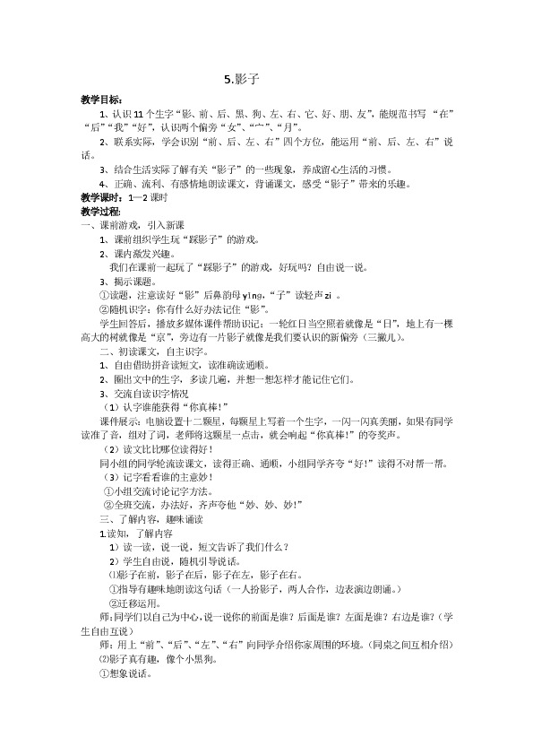 教学目标: 1、认识11个生字“影、前、后、黑、狗、左、右、它、好、朋、友”,能规范书写 “在”“后”“我”“好”,认识两个偏旁“女”、“宀”、“月”。 2、联系实际,学会识别“前、后、左、右”四个方位,能运用“前、后、左、右”说话。 3、结合生活实际了解有关“影子”的一些现象,养成留心生活的习惯。 4、正确、流利、有感情地朗读课文,背诵课文,感受“影子”带来的乐趣。教学课时:1—2课时