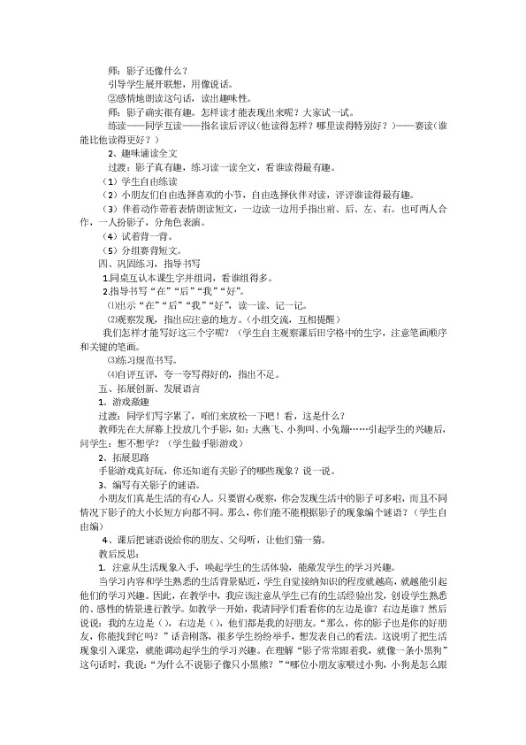 一、课前游戏,引入新课 1、课前组织学生玩“踩影子”的游戏。 2、课内激发兴趣。 我们在课前一起玩了“踩影子”的游戏,好玩吗?自由说一说。 3、揭示课题。 ①读题,注意读好“影”后鼻韵母yXXXXXnXXXXX,“子”读轻声zi 。 ②随机识字:你有什么好办法记住“影”。 学生回答后,播放多媒体课件帮助识记:一轮红日当空照着就像是“日”,地上有一棵高大的树就像是“京”,旁边有一片影子就像是我们要认识的新偏旁(三撇儿)。 二、初读课文,自主识字。 1、自由借助拼音读短文,读准确读通顺。 2、圈出文中的生字,多读几遍,并想一想怎样才能记住它们。 3、交流自读识字情况 (1)认字谁能获得“你真棒!” 课件展示:电脑设置十二颗星,每颗星上写着一个生字,一闪一闪真美丽,如果有同学读准了音,组对了词,老师将这颗星一点击,就会响起“你真棒!”的夸奖声。 (2)读文比比哪位读得好! 同小组的同学轮流读课文,读得正确、通顺,小组同学齐某某“好!”读得不对帮一帮。 (3)记字看看谁的主意妙! ①小组交流讨论记字方法。 ②全班交流,办法好,齐声夸他“妙、妙、妙!” 三、了解内容,趣味诵读 1.读知,了解内容 1)读一读,说一说,短文告诉了我们什么? 2)学生自由说,随机引导说话。 ⑴影子在前,影子在后,影子在左,影子在右。 ①指导有趣味地朗读这句话(一人扮影子,两人合作,边表演边朗诵。) ②迁移运用。 师:同学们以自己为中心,说一说你的前面是谁?后面是谁?左面是谁?右边是谁?(学生自由互说) 师:用上“前”、“后”、“左”、“右”向同学介绍你家周围的环境。(同桌之间互相介绍) ⑵影子真有趣,像个小黑狗。 ①想象说话。 师:影子还像什么? 引导学生展开联想,用像说话。 ②感情地朗读这句话,读出趣味性。 师:影子确实很有趣。怎样读才能表现出来呢?大家试一试。 练某某——同学互读——指名读后评议(他读得怎样?哪里读得特别好?)——赛读(谁能比他读得更好?) 2、趣味诵读全文 过渡:影子真有趣,练习读一读全文,看谁读得最有趣。 (1)学生自由练某某 (2)小朋友们自由选择喜欢的小节,自由选择伙伴对读,评评谁读得最有趣。 (3)伴着动作带着表情朗读短文,一边读一边用手指出前、后、左、右。也可两人合作,一人扮影子,分角色表演。 (4)试着背一背。 (5)分组赛背短文。 四、巩固练习,指导书写 1.同桌互认本课生字并组词,看谁组得多。 2.指导书写“在”“后”“我”“好”。 ⑴出示“在”“后”“我”“好”,读一读、记一记。 ⑵观察发现,指出应注意的地方。(小组交流,互相提醒) 我们怎样才能写好这三个字呢?(学生自主观察课后田字格中的生字,注意笔画顺序和关键的笔画。 ⑶练习规范书写。 ⑷自评互评,夸一夸写得好的,指出不足。 五、拓展创新、发展语言 1、游戏激趣 过渡:同学们写字累了,咱们来放松一下吧!看,这是什么? 教师先在大屏幕上投放几个手影,如:大燕飞、小狗叫、小兔蹦XXXXXXXXXX引起学生的兴趣后,问学生:想不想学?(学生做手影游戏) 2、拓展思路 手影游戏真好玩,你还知道有关影子的哪些现象?说一说。 3、编写有关影子的谜语。 小朋友们真是生活的有心人。只要留心观察,你会发现生活中的影子可多啦,而且不同情况下影子的大小长短方向都不同。那么,你们能不能根据影子的现象编个谜语?(学生自由编) 4、课后把谜语说给你的朋友、父母听,让他们猜一猜。 教后反思: