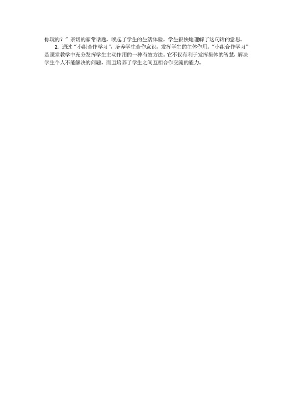 1.注意从生活现象入手,唤起学生的生活体验,能激发学生的学习兴趣。 当学习内容和学生熟悉的生活背景贴近,学生自觉接纳知识的程度就越高,就越能引起他们的学习兴趣。因此,在教学中,我应该注意从学生已有的生活经验出发,创设学生熟悉的、感性的情景进行教学。如教学一开始,我请同学们看看你的左边是谁?右边是谁?然后说说:我的左边是(),右边是(),他们都是我的好朋友。“那么,你的影子也是你的好朋友,你能找到它吗?”话音刚落,很多学生纷纷举手,想发表自己的看法。这说明了把生活现象引入课堂,就能调动起学生的学习兴趣。在理解“影子常常跟着我,就像一条小黑狗”这句话时,我说:“为什么不说影子像只小黑熊?”“哪位小朋友家喂过小狗,小狗是怎么跟你玩的?”亲切的家常话题,唤起了学生的生活体验,学生很快地理解了这句话的意思。 2.通过“小组合作学习”,培养学生合作意识,发挥学生的主体作用。“小组合作学习”是课堂教学中充分发挥学生主动作用的一种有效方法。它不仅有利于发挥集体的智慧,解决学生个人不能解决的问题,而且培养了学生之间互相合作交流的能力。