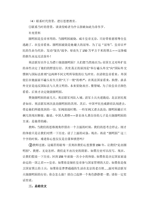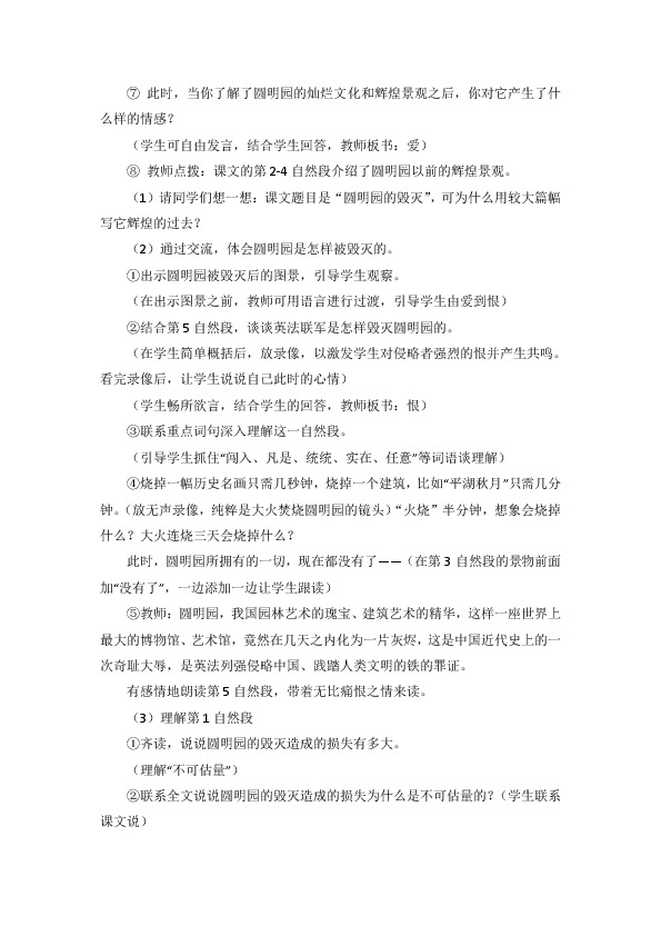 ⑤教师:圆明园,我国园林艺术的瑰宝、建筑艺术的精华,这样一座世界上最大的博物馆、艺术馆,竟然在几天之内化为一片灰烬,这是中国近代史上的一次奇耻大辱,是英法列强侵略中国、践踏人类文明的铁的罪证。