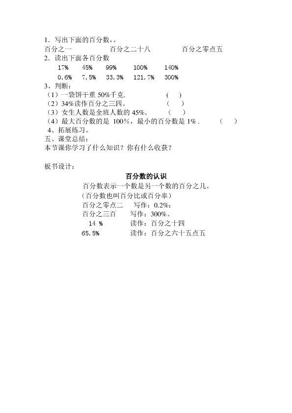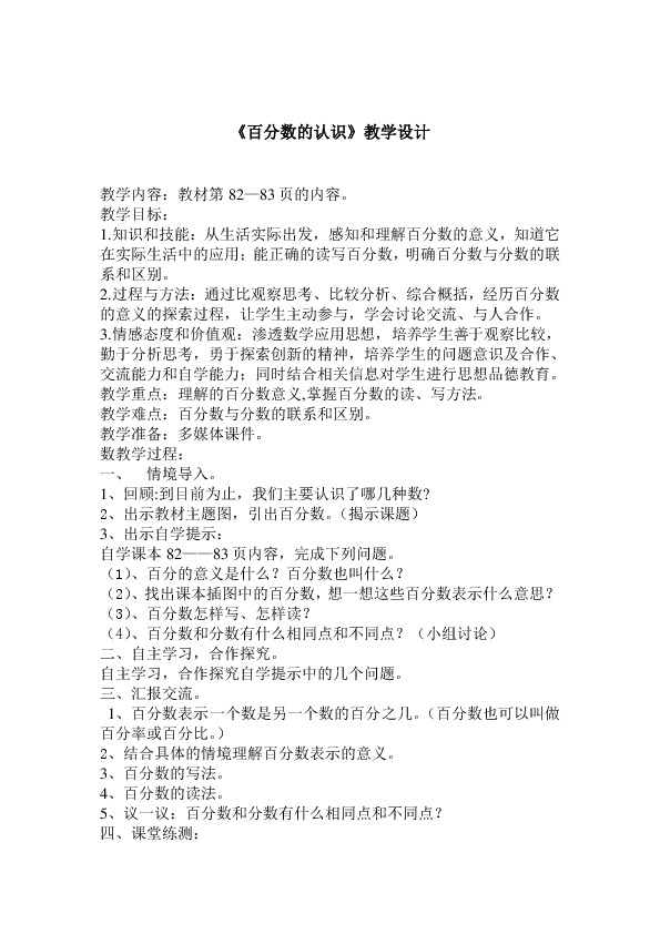 1.知识和技能:从生活实际出发,感知和理解百分数的意义,知道它在实际生活中的应用;能正确的读写百分数,明确百分数与分数的联系和区别。
