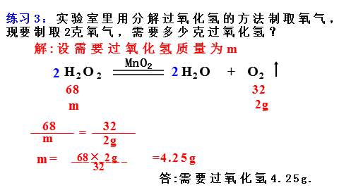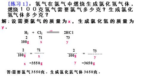 ---------- = ------326gX(4) 列比例式,求解.….…….列(1分)X = 0.6 g答:加热分解6克高锰酸钾,可以得到氧气0.6克。 ….. …... …………………算(1 分) (5) 简明地写出答案…..….答(0.5分)(不要带单位)[练习1]:氢气在氯气中燃烧生成氯化氢气体,燃烧100克氢气需要氯气多少克?生成氯化氢气体多少克?解:设需要氯气的质量为x,生成氯化氢的质量为y. H2 + Cl2 点燃2HCl↑2 71 73 100g x y2-------100g=71-------xx =3550g答:需要氯气3550克.生成氯化氢气体3650克.