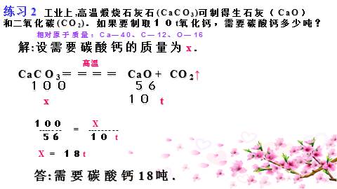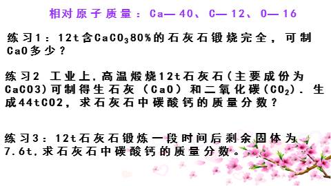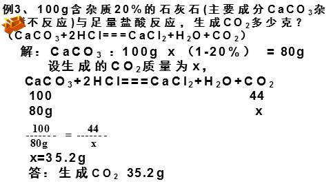 73 = ----------y=3650gy2-------100gx解:①O2:34g-24.4g=9. 内容过长,仅展示头部和尾部部分文字预览,全文请查看图片预览。 确(保留两位小数);【三个关键】(1)准确书写化学方程式;(2)准确计算相对分子质量;(3)代入量均指纯净物的质量(单位要代入计算过程);练习2 工业上,高温煅烧12t石灰石(主要成份为CaCO3)可制得生石灰(CaO)和二氧化碳(CO2).生成44tCO2,求石灰石中碳酸钙的质量分数?相对原子质量:Ca—40、C—12、O—16练习3:12t石灰石锻炼一段时间后剩余固体为7.6t,求石灰石中碳酸钙的质量分数。练习1:12t含CaCO380%的石灰石锻烧完全,可制CaO多少?[文章尾部最后300字内容到此结束,中间部分内容请查看底下的图片预览]