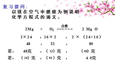 化学方程式的涵义。2Mg + O2 ====== 2 Mg O 2×24 :16×2 : 2 × (24+16) 48 : 32 : 80若: 48克 :( )克 : ( )克点燃若: ( )克 :( )克 : 4 0克32802416说明: