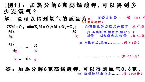 因此,利用正比例关系可以根据化学方程式进行相关计算[例1]:加热分解6克高锰酸钾,可以得到多少克氧气?解:设可以得到氧气的质量为x(1)设未知量… …设 (0.5 分) 2KMnO4 △ K2MnO4+MnO2+O2↑316 32