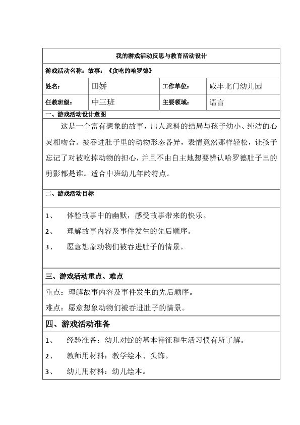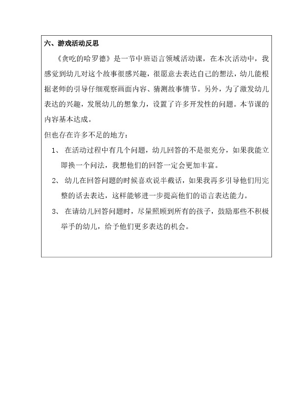《贪吃的哈罗德》是一节中班语言领域活动课,在本次活动中,我感觉到幼儿对这个故事很感兴趣,很愿意去表达自己的想法,幼儿能根据老师的引导仔细观察画面内容、猜测故事情节。另外,为了激发幼儿表达的兴趣,发展幼儿的想象力,设置了许多开发性的问题。本节课的内容基本达成。