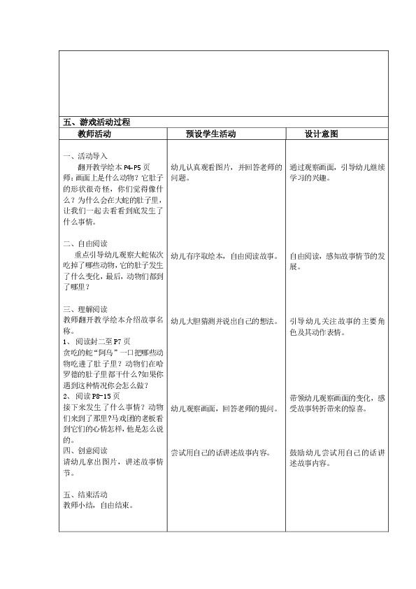 师:画面上是什么动物?它肚子的形状很奇怪,你们觉得像什么?为什么会在大蛇的肚子里,让我们一起去看看到底发生了什么事情。