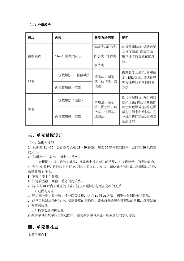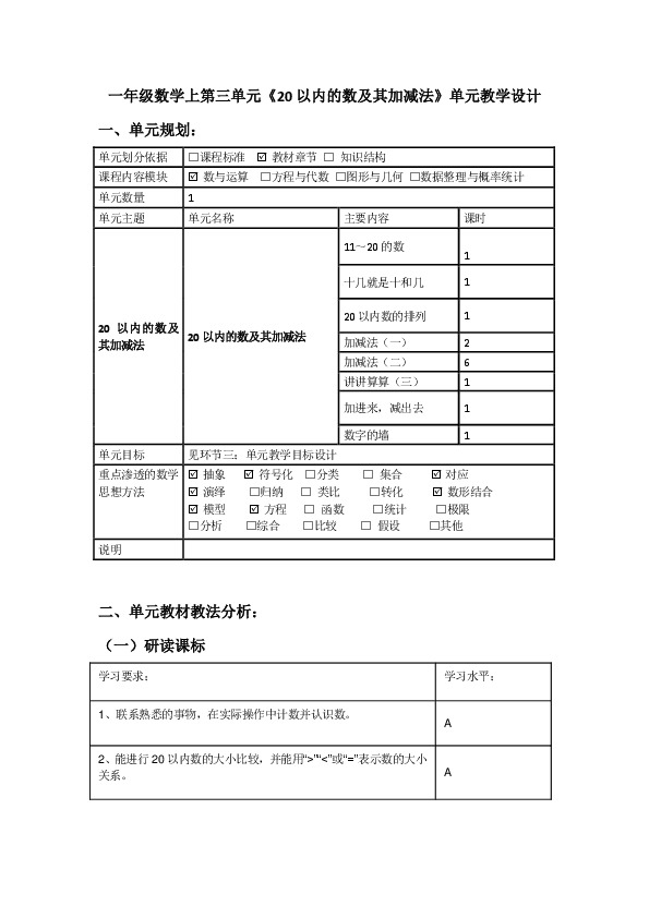 一年级数学上第三单元《20以内的数及其加减法》单元教学设计