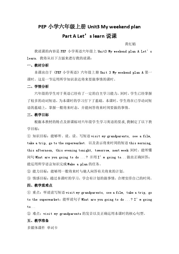我说课的内容是PEP小学英语六年级上Unit3 My weekend plan A Let’s learn. 我将从以下方面来进行我的说课: