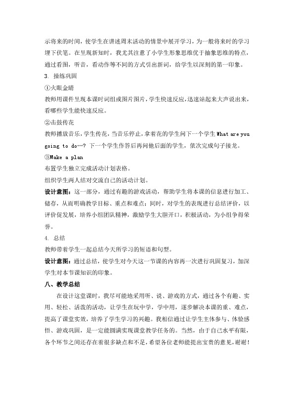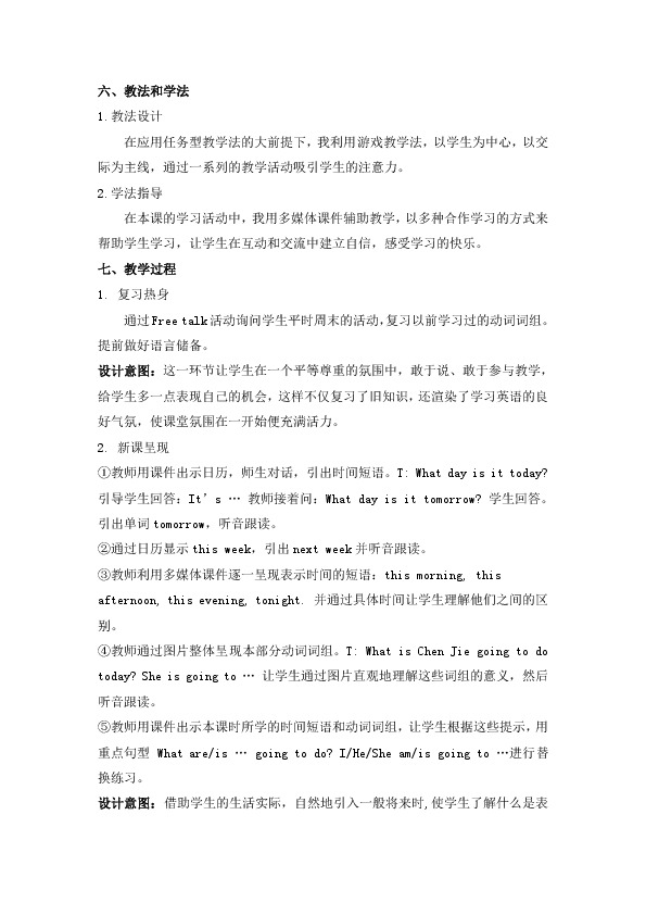 设计意图:借助学生的生活实际,自然地引入一般将来时,使学生了解什么是表示将来的时间,使学生在讲述周末活动的情景中展开学习,为一般将来时的学习埋下伏笔。在呈现新知时,我尤其注意了小学生形象思维优于抽象思维的特点,通过看图,听音,看动作等不同的方式引出新词,给学生以深刻的第一印象。