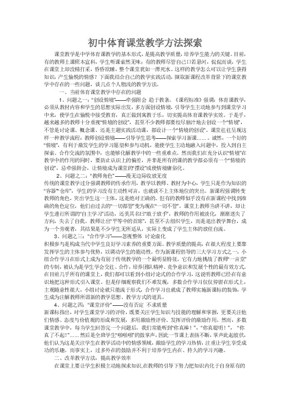 以下为《初中体育课堂教学方法探索》的无排版文字预览,完整格式请下载