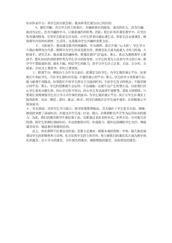 课堂教学是中学体育课教学的基本形式,是提高教学质量,培养学生能力的关键。目前,有的教师上课照本宣科,学生听课索然无味;有的教师尽管自己口若悬河,侃侃而谈,学生在课堂上却没精打采,昏昏欲睡,整个课堂犹如一潭死水。这样的教学怎么可以让学生获得知识,产生愉悦的情感?下面我结合自己的教学实践活动,撷取新课程改革背景下的课堂教学中存在的一些问题,谈几点个人粗浅的教学方法。? 一、当前体育课堂教学中存在的问题? 1、问题之一:“创设情境”——牵强附会 趋于教条。《课程标准》强调:体育课教学,必须从教材内容和学生的思想实际出发,多方面创设情境,引导学生主动地参与到课堂学习中来,使学生在愉悦中接受教育,真正做到寓教于乐,切实提高体育课教学实效。于是乎,越来越多的教师十分重视“情境的创设”,甚至不少教师都要绞尽脑汁地去创设一个“情境”,不管是讨论课、概念课、还是主题实践活动课,都设计一个“情境的创设”。课堂往往呈现这样一种教学流程:教师创设情境——引导学生思考——探索学习新课XXXXXXXXXX。诚然,一个好的“情境”,有利于激发学生的学习愿望和参与动机,能使学生主动地融入问题中,投入到自主探索、合作交流的氛围中,也能够化解教学中的一些重难点。然而我们在充分认识“情境”在教学中的作用的同时,要防止认识上的偏差,并非是所有的课的教学都必须有一个“情境的创设”,忌牵强附会,让情境成为课堂的“摆设”或使情境庸俗化。? 2、问题之二:“教师角色” ——漫无边际收放无度?传统的课堂教学过分强调教师的传承作用,教学以教师、教材为中心,学生只是作为知识的“容器”“仓库”,学生的学习没有主动性可言,也就谈不上主体地位的突出。新课程强调转变教师的角色,突出学生这一主体,这是绝对正确的。但有的教师似乎没有在新课程中找到准确的角色定位,他们由过去的“一切都管”变为现在“一切不管”。课堂上教师当讲不讲,却让学生进行所谓的“自主学习”活动,还美其名曰“敢于放手”,教师的作用被淡化,渐渐迷失了方向,失去了自我。教师让出“平等中的首席”,甚至不去组织学生,而是退出教学舞台,成为一个旁观者,其结果是不少学生无所适从,实际上变成了学生主体的放任自流。? 3、问题之三:“合作学习”——忽视整体 讨论虚化?积极参与是构成当代中学生良好学习素养的重要方面。教学质量的提高,在很大程度上要靠发挥学生的主体参与优势,以调动学生的能动性。作为新课程倡导的三大学习方式之一,小组合作学习在形式上成为有别于传统教学的一个最明显特征。它有力地挑战了教师“一言堂”的专制,被认为是学生学会交往、合作,培养团队精神、竞争意识和发展个性的最有效方式。在目前几乎所有的课堂上,我们都可以看到小组讨论式的合作学习,这说明教师已经在有意识地把这种形式引入课堂。但是仔细观察我们不难发现,多数合作学习仅仅停留在形式上,主观随意性很大,小组讨论就只能流于形式,合作学习也就成了教师实施新课标的装饰,学生成为注解教师所谓新的教学思想、教学方式的道具。? 4、问题之四:“课堂评价” ——没有否定 不求质量?新课标指出,对学生课堂学习的评价,既要关注学生知识与技能的理解和掌握,更要关注他们情感、态度与价值观的形成和发展,多用激励性评价、发挥评价的激励作用。然而,多数课堂教学中,每当学生回答完一个问题后,我们常能听到“你真棒!”,“你真聪明!”, “你真了不起!”XXXXXXXXXX然后是全班学生“啪啪啪”的鼓掌声,因此一节课上表扬不断,掌声此起彼伏,他们认为这是关注学生在教学活动中的情感领域,激励学生的学习热情,注重让学生享受成功的乐趣。而事实上,过多外在的鼓励并不利于培养学生内在、持久的学习兴趣。? 二、改革教学方法,提高教学效率? 在课堂上要让学生积极主动地探求知识,在教师的引导下努力把知识内化于自身原有的知识体系中去,将学生的自我发展、提高和变化视为自己的目的。? 1、激发兴趣,突出学生的主体地位。兴趣是快乐的源泉,成功的动力,没有兴趣,就没有记忆,没有兴趣的学习,只能是痛苦的煎熬。因此,我们在体育课堂教学中,应突出体育课的特征,引导学生联系生活实际,让学生带着问题走进生活,带着生活走进课堂,增强教学内容的实践性、生活化,这是提高学生兴趣的重要方法。? 2、大胆放手,提高课堂教学的情趣性。作为教师,我们不能 “心太软”,学生学习不能由教师包办代替,教师应为学生终身发展负责,使课堂真正成为造就人才的主阵地。大胆放手,讲究艺术,提高课堂的趣味性,使课堂教学“活”起来。那么,我认为教师教学上要放手,要从知识的讲授者转变为学生学习的指导者,让学生转变为主动参与学习的主体。教学中不要面面俱到,滴水不漏,相信学生的能力,放手让学生自己去看,去读,去分析,去探索,在形式上要放开,时间上要放宽。? 3、搭建平台,增强自主合作学习意识。把课堂交给学生,为学生提供展示平台。如果我们不相信学生,不给学生留时间交流,不提供展示的平台,那么,学生的学习效果就不好,能力就得不到提高。如果我们不给学生留自主交流的时间,不给学生发言的机会,不提供展示的平台,那么,学生的思维就不会运转,不会碰撞,也就不