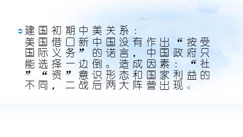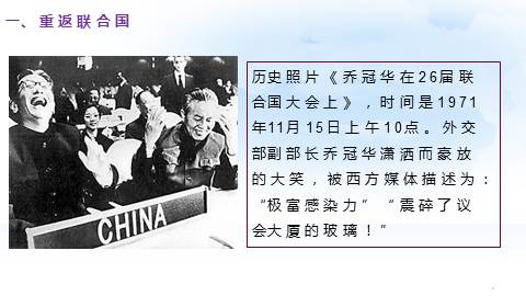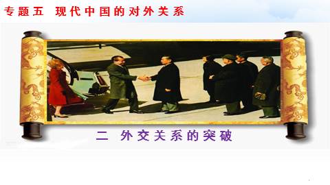专题五 现代中国的对外关系二 外交关系的突破一、重返联合国历史照片《乔某某在26届联合国大会上》,时间是1971年11月15日上午10点。外交部副部长乔某某潇洒而豪放的大笑,被西方媒体描述为: “极富感染力”“震碎了议会大厦的玻璃!”外交部发言人答记者问中国在联合国的合法席位为什么是恢复而不是加入?中国在联合国的合法席位是怎样得以恢复的?中国为什么能够恢复在联合国的合法席位? 中国重返联合国有何深远意义?(1) 1945年中国是联合国创始国之一,也是安理会常任理事国之一。中国对联合国的筹建和成立做过重要贡献。(2)1949年中华人民共和国成立,按国际法惯例,新政权就自然取得在联合国的一切权力。但由于美国的阻挠,这个问题一直被搁置,直到70年代初才得到彻底解决。因此说是合法席位被恢复。