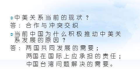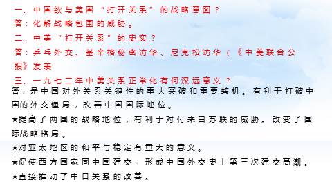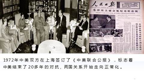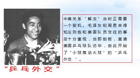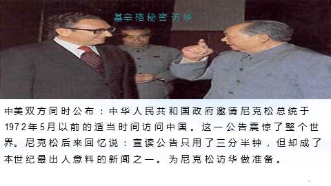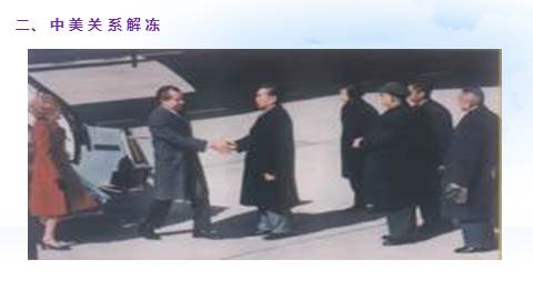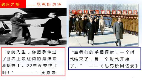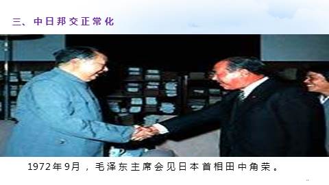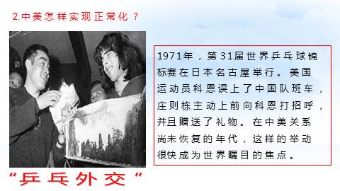 ——乔治·桑特尔《尼克松传》尼克松访问巴基斯坦时,也对叶某某·汗说:“中美两国对骂了20年,相互敌视,互不来往,我想结束这种状况。”二、中美关系解冻1971年,第31届世界乒乓球锦标赛在日本名古屋举行。美国运动员科恩误上了中国队班车,庄则栋主动上前向科恩打招呼,并且赠送了礼物。在中美关系尚未恢复的年代,这样的举动很快成为世界瞩目的焦点。“乒乓外交”2.中美怎样实现正常化?中美关系“解冻”当时正需要一个契机。毛泽东和周恩来得知庄则栋和美国队员交往的事后十分重视,当即拍板,邀请美国乒乓球队访华,由此开始了“小球推动大球”的“乒乓外交 ”。“乒乓外交” 中美双方同时公布:中华人民共和国政府邀请尼克松总统于1972年5月以前的适当时间访问中国。这一公告震惊了整个世界。尼克松后来回忆说:宣读公告只用了三分半钟,但却成了本世纪最出人意料的新闻之一。为尼克松访华做准备。基辛格秘密访华“总统先生,你把手伸过了世界上最辽阔的海洋来和我握手。22年没交往了呵!” ——周恩来“当我们的手相握时,一个时代结束了,另一个时代开始了。” ——《尼克松回忆录》破冰之旅——尼克松访华1972年中美双方在上海签订了《中美联合公报》,标志 内容过长,仅展示头部和尾部部分文字预览,全文请查看图片预览。 需要。 1972年9月,毛泽东主席会见日本首相田中角荣。三、中日邦交正常化1972年9月29日周恩来总理和田中角荣总理大臣在北京签署《中日联合声明》,中日两国之间的不正常状态宣告结束,并正式建立外交关系。中日邦交正常化意义结束了中日两国长期敌对的历史,打开了两国睦邻友好的历史新篇章。有利于两国关系的发展和亚洲乃至世界的和平与稳定,缓和世界紧张局势。突破之一:重返联合国突破之二:中美关系正常化突破之三:中日邦交正常化关键课堂小结[文章尾部最后300字内容到此结束,中间部分内容请查看底下的图片预览]