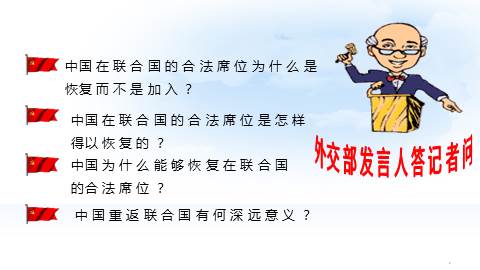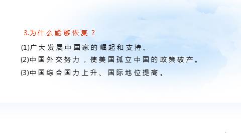 (2)1971年10月25日,第26届联大以76票赞成、35票反对、17票弃权的压倒多数决定恢复中华人民共和国在联合国的一切合法权利。这就是联大2758号决议, 公正彻底地解决了中国在联合国的代表权问题。 2.怎样得以恢复?——艰难历程3.为什么能够恢复? (1)广大发展中国家的崛起和支持。(3)中国综合国力上升、国际地位提高。(2)中国外交努力,使美国孤立中国的政策破产。是中国外交事业的重大胜利,是美国孤立中国政策的破产;