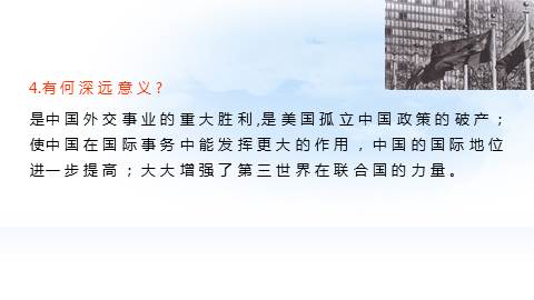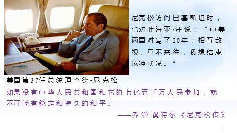 使中国在国际事务中能发挥更大的作用,中国的国际地位进一步提高;大大增强了第三世界在联合国的力量。4.有何深远意义?美国第37任总统理查德?尼克松如果没有中华人民共和国和它的七亿五千万人民参加,就