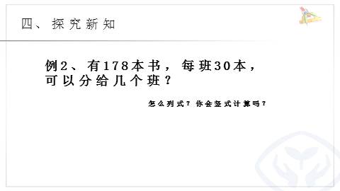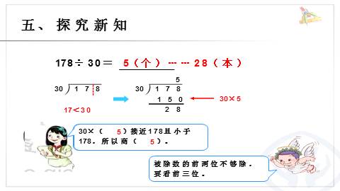 你是怎么算的。四、探究新知例2、有178本书,每班30本,可以分给几个班?怎么列式?你会竖式计算吗?五、探究新知17<3051 5 02 830×555178÷30=5(个)……28(本)六、知识运用71 4 01 052 5 03 075 6 05完成下面的竖式,说一说