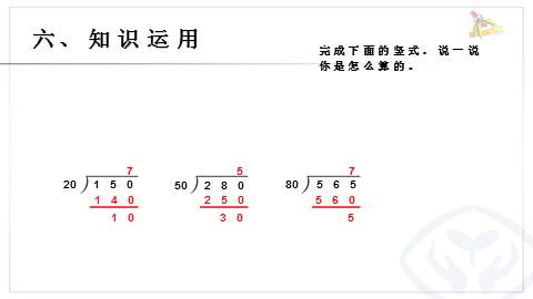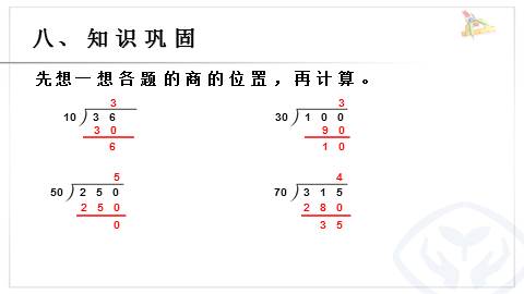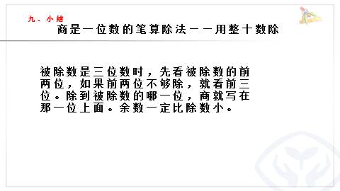商是一位数的笔算除法——用整十数除被除数是三位数时,先看被除数的前两位,如果前两位不够除,就看前三位。除到被除数的哪一位,商某某在那一位上面。余数一定比除数小。十、布置作业作业:第75页练习十三,第9~11题。[全文已结束,注意以上仅为全文的文字预览,不包含图片和表格以及排版]
