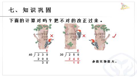 你是怎么算的。七、知识巩固下面的计算对吗?把不对的改正过来。××√余数比除数大。八、知识巩固33 0652 5 0039 01 042 8 03 5九、小结