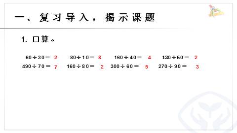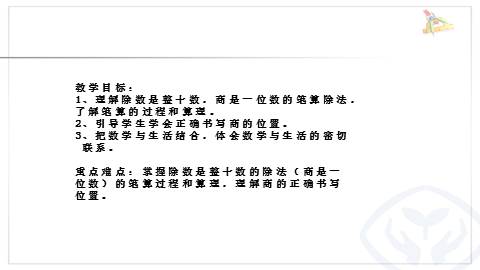1、理解除数是整十数,商是一位数的笔算除法, 了解笔算的过程和算理。