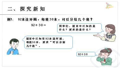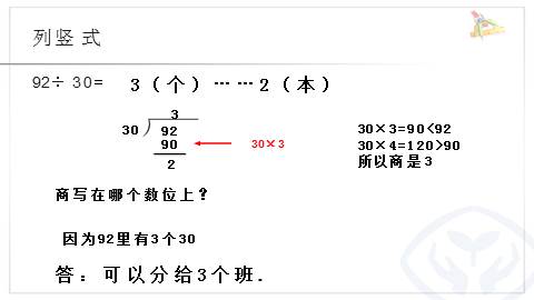 余下的数必须要比除数小。二、探究新知 92÷30=例1. 92本连环画,每班30本,可以分给几个班?列竖式92÷30=