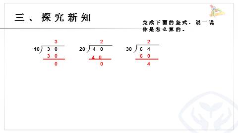 余数比除数小。三、探究新知33 0024 0026 04完成下面的竖式,说一说