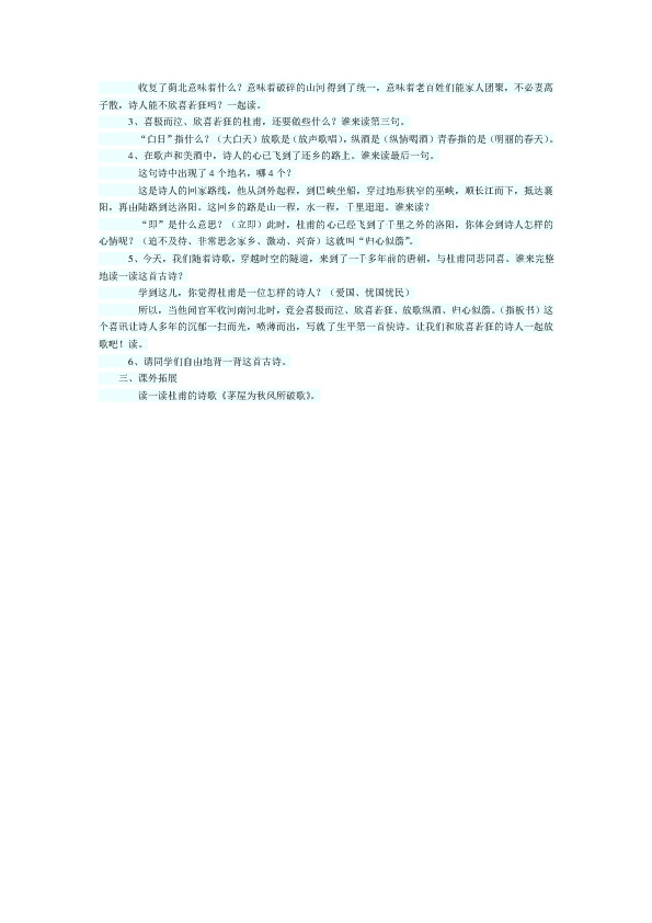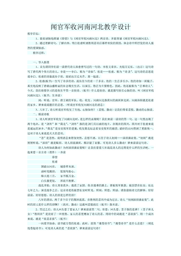 教学目标: 1、能有感情地朗诵《春望》与《闻官军收河南河北》两首诗,并能背诵《闻官军收河南河北》。 2、通过理解诗句,了解内容,明白杜甫听到胜利喜讯后那样欢快的原因,体会诗中所抒发的诗人强烈的爱国情感。 教学过程: 一、导入新课 1、首先请同学们读一读唐代诗人韩愈曾写过的一句诗:李杜文章在,光焰万丈长。(出示)这句诗写了唐代两个伟大的诗人,李某某——李白,称为“诗仙”,杜某某——杜甫,称为“诗圣”。这句诗的意思是说李白、杜甫的诗篇流传于世,放射出万丈光芒。再一起读。 2、杜甫(板书)一生写了许多的诗,流传至今的有一千多首。他的一生苦多乐少,他的诗如一面镜子,真实地反映了唐朝由盛转衰的社会现实生活,以深沉、愁苦为主要特色,因此,他还被称为“苦难诗人”。今天,我们将要学习的是他生平第一首快诗。(板书)什么是快诗,就是描写快乐心情的诗,叫《闻官军收河南河北》。(板书,生齐读) 闻:听说,官军:唐王朝的军队。收:收复,河南河北指黄河的南面和北面。河南洛阳就是杜甫的家乡。谁来说说题目的意思。(听说官军收复河南河北的消息) 3、八年了,诗人听说官军收复了失地,心情如何?(喜悦、激动)让我们带着喜悦、激动的心情读。 二、精读诗歌 1、诗人听到官军收复了河南河北时,是怎样的表现呢?我们来读一读诗的第一句。这一句里出现了两个地名,是“剑外”和“蓟北”,“剑外”指的是剑门关以南的地主,在现在的四川,四川对于杜甫来说是遥远的异乡。“蓟北”是安史叛军的老巢,收复蓟北标志着安史叛军的崩溃,破碎的山河得到了重新统一,这对于诗人来说是天大的喜讯。 “忽”是忽然,说明消息来得很突然,意想不到,以至于诗人初闻——涕泪满衣某某。“初闻”就是刚刚听说,“涕泪”就是眼泪。诗人泪流满面,都沾湿了衣服。可见诗人多么激动!谁来读读这句诗。 诗人为何如此激动?为何涕泪满衣某某呢?让我们看看八年战乱诗人的过得是什么样的生活吧。一起来看一首古诗(课件)一齐读 春望 杜甫 国破山河在, 城春草木深。 感时花某某, 恨别鸟惊心。 烽火连三月, 家书抵万金。 白头搔更短, 浑欲不胜簪。 战乱开始,诗人背景离乡,逃离了家园。他在逃难的路上,曾被叛军抓获,被囚禁在长安,长达七年之久,深受战争之苦,这首诗是他被禁长安时所见,所闻,所思,所感。请你借助诗文的解释,好好读读,好好想想,诗人的泪是怎样的泪? 八年的漂泊,两千多个日子的颠沛流离,在胜利的喜讯中成为过去。诗人“初闻涕泪满衣某某”,此时的泪又是什么样的泪啊?(高兴、激动)这就叫喜极而泣(板书)指名读。 2、哭过之后,诗人回头看了看家人?谁来读读第二句。却看:回头看。妻子指的是谁?(妻子和儿女)“愁何在”是没有了一丝忧愁。家人的喜更增加了诗人的喜。用诗中的词就是“喜欲狂”,用一个成语来说,就是“欣喜若狂”。(板书) 一向爱书如命,读书破万卷的杜甫,此时,居然“漫卷诗书”,“漫卷诗书”是什么意思?(胡乱地卷起诗书),可见诗人真的是“喜欲狂”,谁来读读这句诗? 收复了蓟北意味着什么?意味着破碎的山河得到了统一,意味着老百姓们能家人团聚,不必妻离子散,诗人能不欣喜若狂吗?一起读。 3、喜极而泣、欣喜若狂的杜甫,还要做些什么?谁来读第三句。 “白日”指什么?(大白天)放歌是(放声歌唱),纵酒是(纵情喝酒)青春指的是(明丽的春天)。 4、在歌声和美酒中,诗人的心已飞到了还乡的路上。谁来读最后一句。 这句诗中出现了4个地名,哪4个? 这是诗人的回家路线,他从剑外起程,到巴峡坐船,穿过地形狭窄的巫峡,顺长江而下,抵达襄阳,再由陆路到达洛阳。这回乡的路是山一程,水一程,千里迢迢。谁来读? “即”是什么意思?(立即)此时,杜甫的心已经飞到了千里之外的洛阳,你体会到诗人怎样的心情呢?(迫不及待、非常思念家乡、激动、兴奋)这就叫“归心似箭”。 5、今天,我们随着诗歌,穿越时空的隧道,来到了一千多年前的唐朝,与杜甫同悲同喜。谁来完整地读一读这首古诗? 学到这儿,你觉得杜甫是一位怎样的诗人?(爱国、忧国忧民) 所以,当他闻官军收河南河北时,竟会喜极而泣、欣喜若狂、放歌纵酒、归心似箭。(指板书)这个喜讯让诗人多年的沉郁一扫而光,喷薄而出,写就了生平第一首快诗。让我们和欣喜若狂的诗人一起放歌吧!读。 6、请同学们自由地背一背这首古诗。 三、课外拓展 读一读杜甫的诗歌《茅屋为秋风所破歌》。