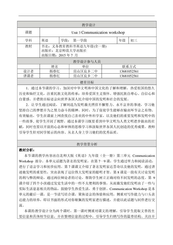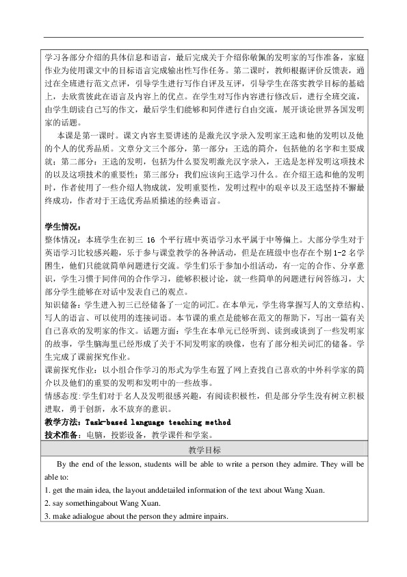 本节课的教学内容出自北师大版《英语》九年级(全一册)第三单元Communication Workshop 部分。本单元话题为著名的发明家,在第7—9课,学生通过听力和阅读活动,进行了语言学习和初步应用。第7课课文介绍了著名发明家达芬奇以及他的发明,通过讲述他发明的重要性,突出表现了这位伟大发明家的聪明才智。第8课是一段有关讨论发明的利与弊的辩论,通过两位辩论者的讨论,帮助学生树立正确对待不同发明的态度。第9课介绍了四个小孩通过发觉生活中的一些不太便利的事情,从而激发他们发明出了一些与实际生活息息相关的物品,鼓励学生热爱生活,勇于创新。Communication Workshop是本单元的最后一课,是一节读写结合课,聚焦语言的体验和应用,侧重对写作能力与口头表达能力的培养,即以书面的形式对你敬佩的发明家进行描述,并能以此话题与同伴进行交流。