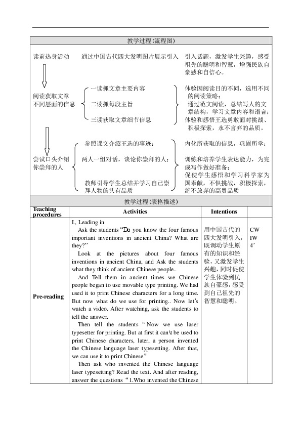 读前热身活动 通过中国古代四大发明图片展示引入 引入话题,激发学生兴趣,感受祖先的聪明和智慧,增强民族自豪感和自信心。