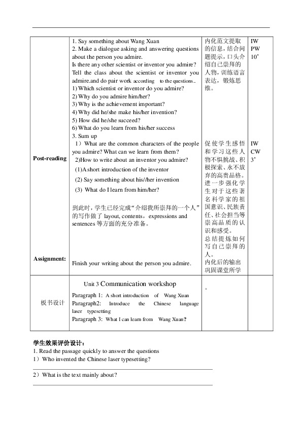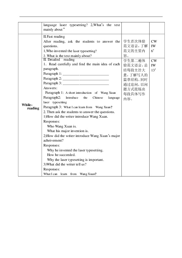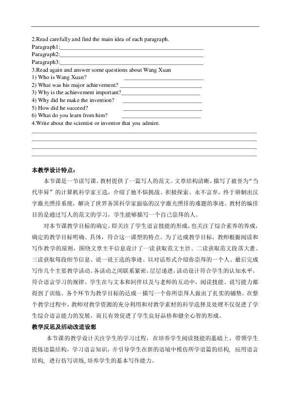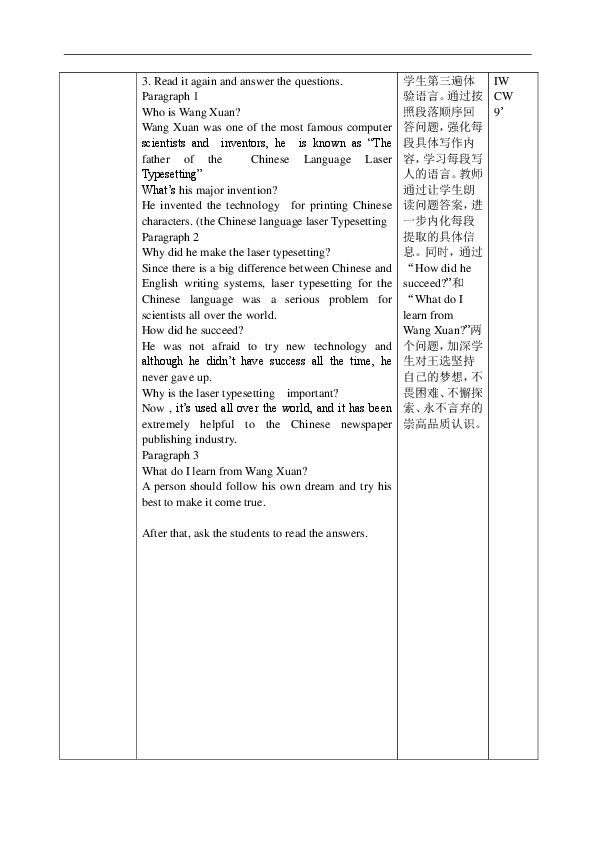 1. get the main idea, the layout anddetailed information of the text about Wang Xuan.