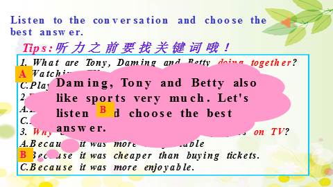 Daming, Tony and Betty also like sports very much. Let's listen and choose the best answer.