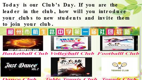 Today is our Club's Day. If you are the leader in the club, how will you introduce your clubs to new students and invite them to join your club.