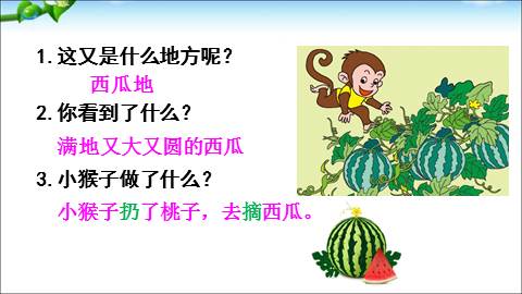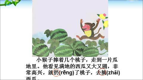 小猴子捧着几个桃子,走到一片瓜地里。他看见满地的西瓜又大又圆,非常高兴,就扔(rXXXXXng)了桃子,去摘(zhXXXXXi)西瓜。