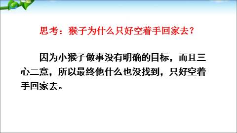 因为小猴子做事没有明确的目标,而且三心二意,所以最终他什么也没找到,只好空着手回家去。