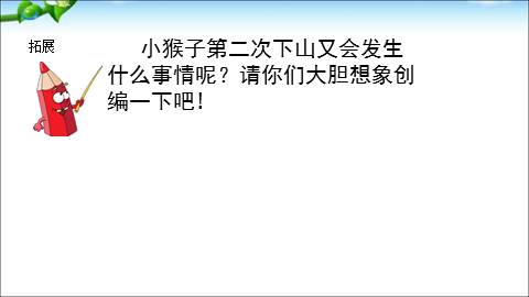 小猴子第二次下山又会发生什么事情呢?请你们大胆想象创编一下吧!