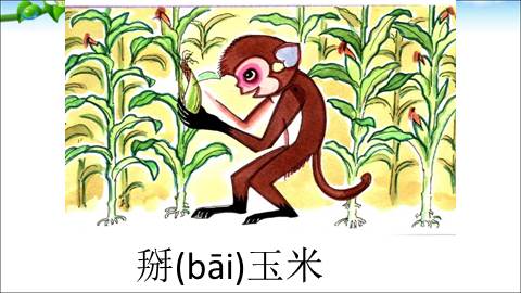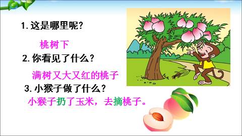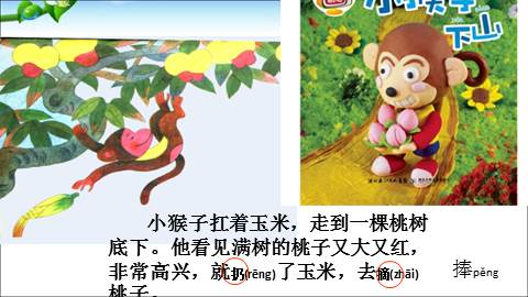 小猴子扛着玉米,走到一棵桃树底下。他看见满树的桃子又大又红,非常高兴,就扔(rXXXXXng)了玉米,去摘(zhXXXXXi)桃子。