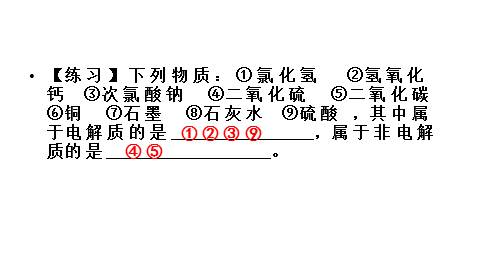 【练习】下列物质:①氯化氢 ②氢氧化钙 ③次氯酸钠 ④二氧化硫 ⑤二氧化碳 ⑥铜 ⑦石墨 ⑧石灰水 ⑨硫酸 ,其中属于电解质的是 ,属于非电解质的是 。
