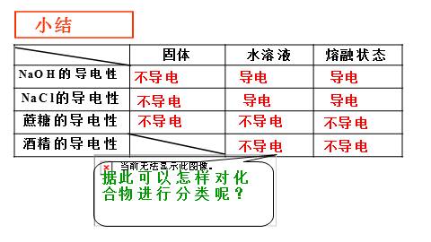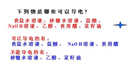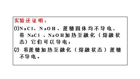 ⑴NaCl、NaOH、蔗糖固体均不导电,将 NaCl 、NaOH加热至融化(熔融状态)它们可以导电;