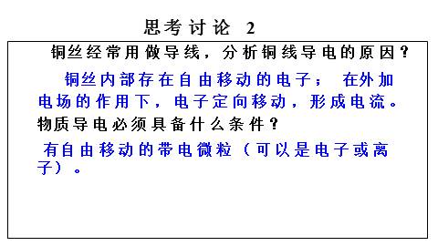 铜丝内部存在自由移动的电子; 在外加电场的作用下,电子定向移动,形成电流。