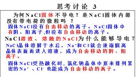 固体NaCl受热融化时, 氯化钠晶体中原来排列紧密的Na+?、Cl- 也能成为自由移动的离子。
