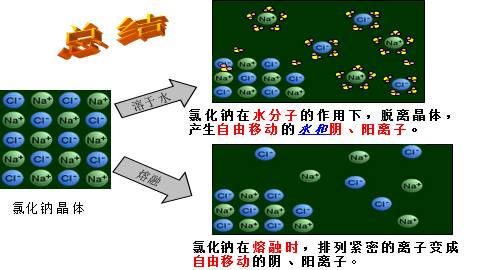 氯化钠在熔融时,排列紧密的离子变成自由移动的阴、阳离子。