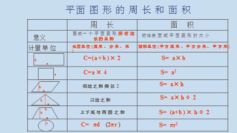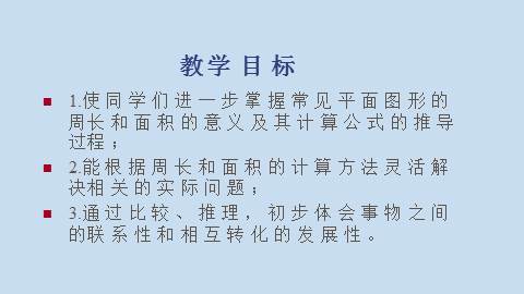 1.使同学们进一步掌握常见平面图形的周长和面积的意义及其计算公式的推导过程;